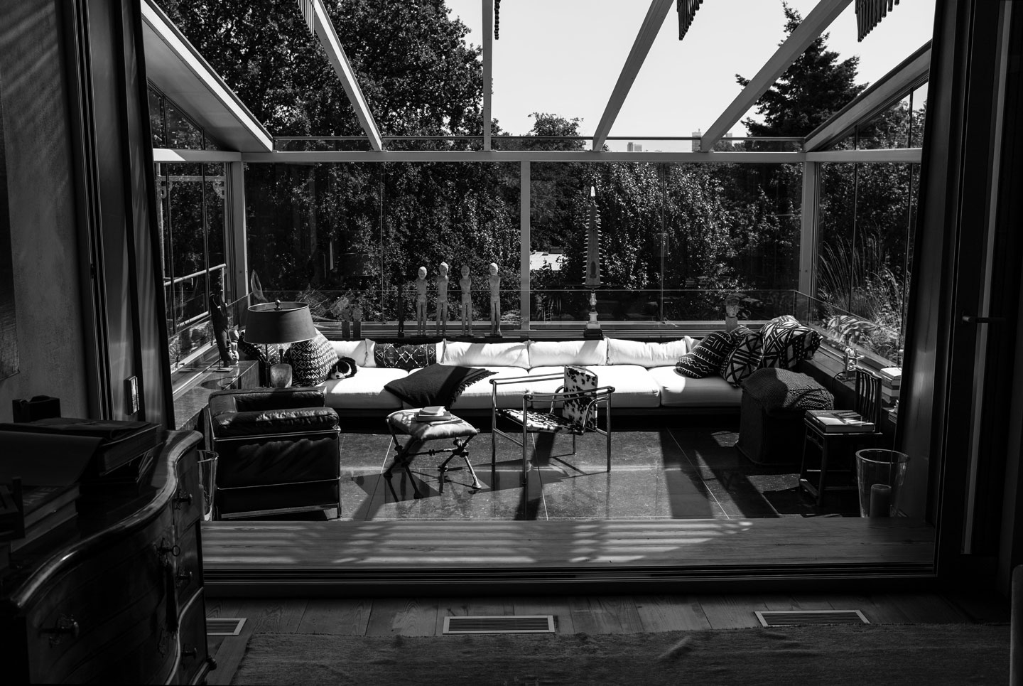 Persönliche Stücke verleihen dem Penthouse seine Seele: Steinskulpturen, Erinnerungsstücke von Reisen, ein in Kolumbien erworbener Poncho, der heute gerahmt wie ein Kunstwerk wirkt.