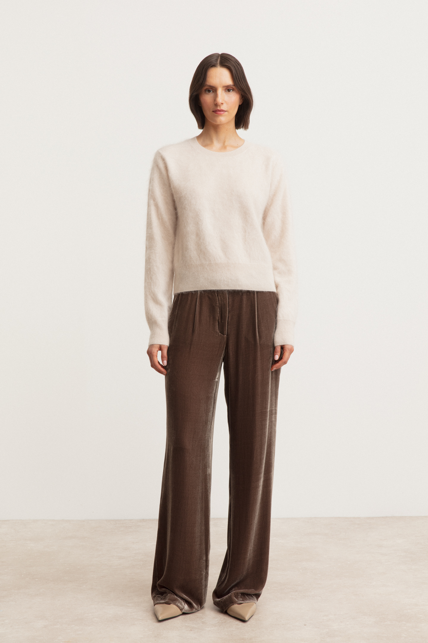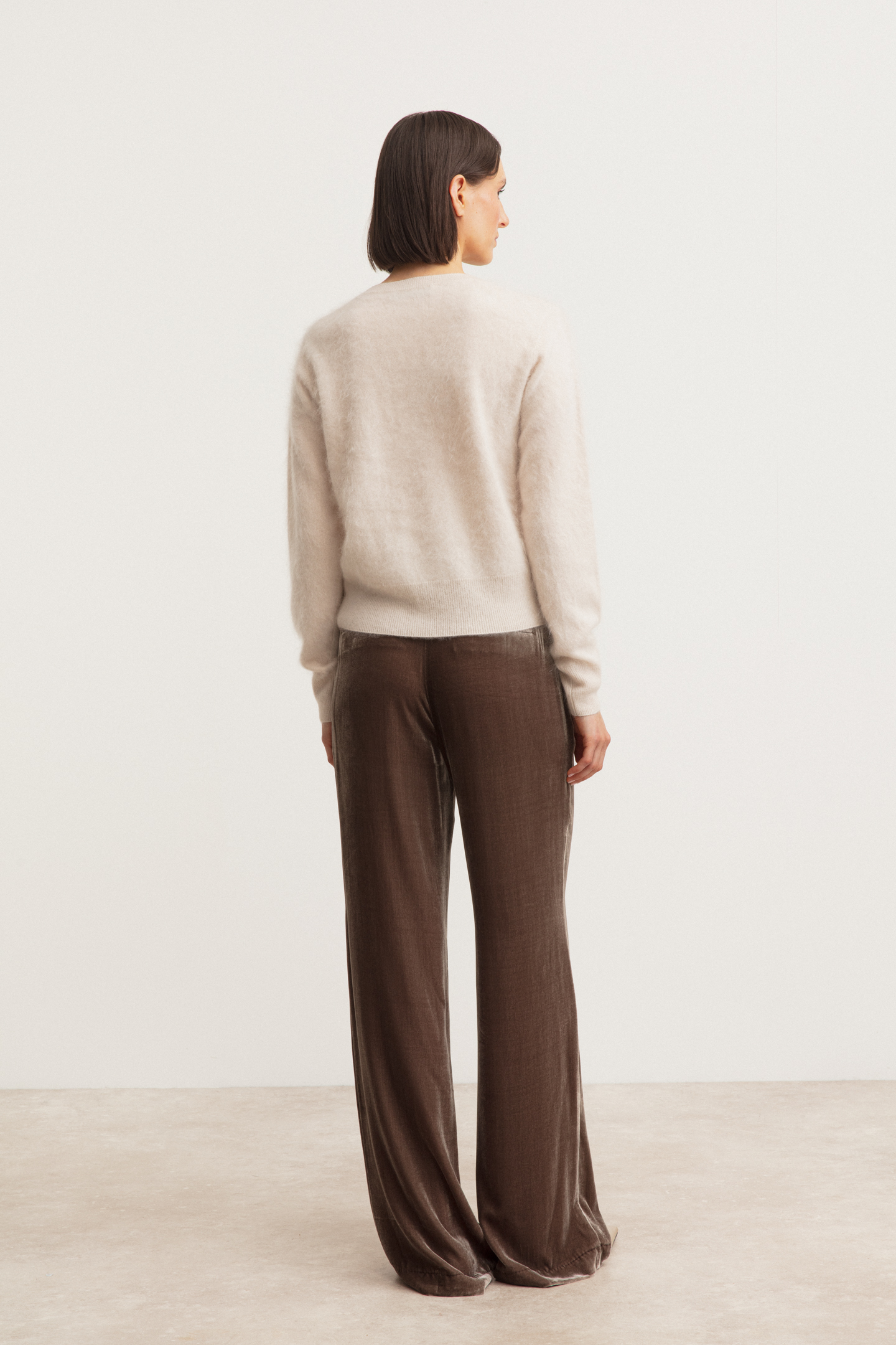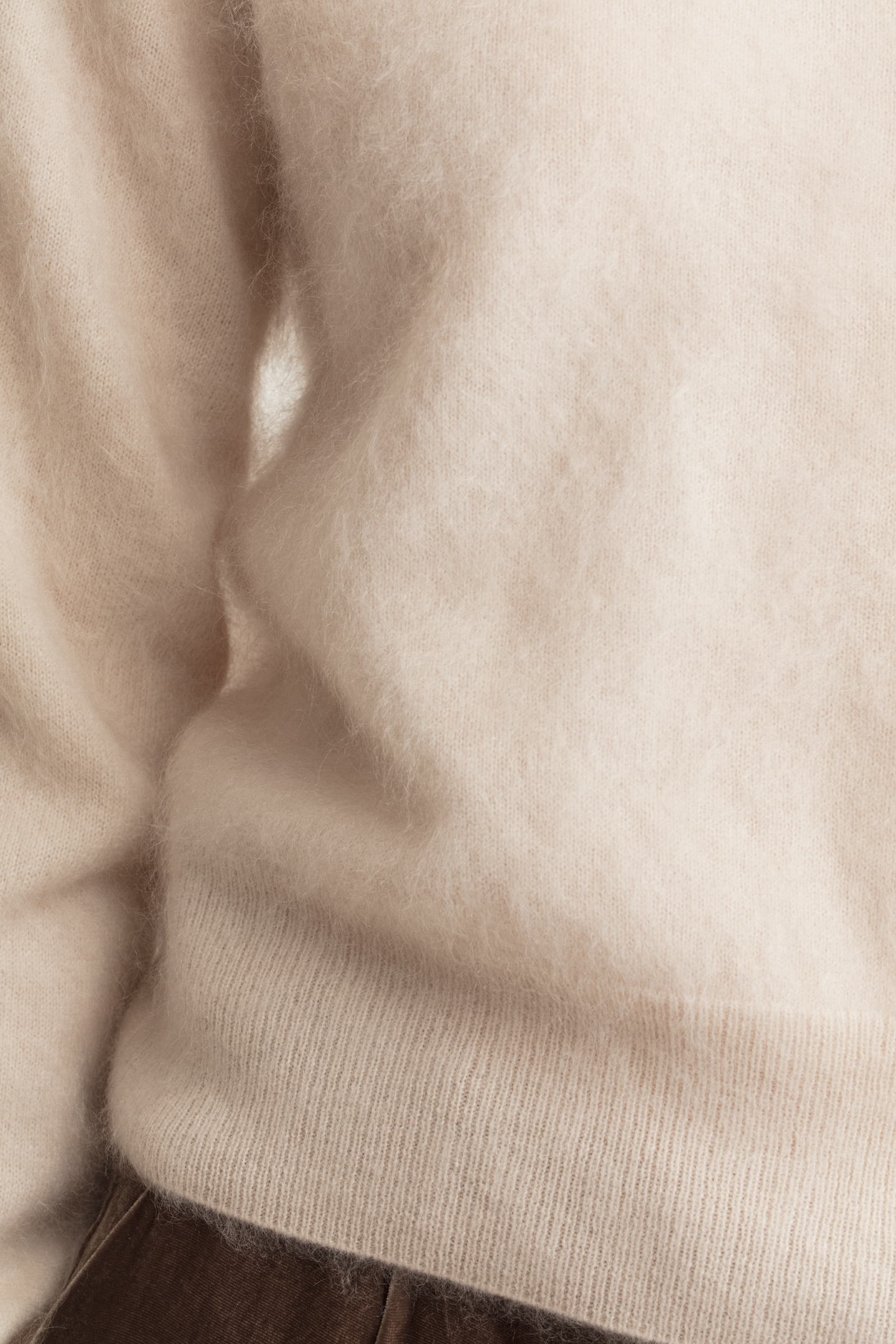 Our brushed cashmere is characterized by its exceptional lightness and fluffiness. This fine quality is achieved through an elaborate brushing process on both the inside and outside and only works with the highest quality and longest cashmere fibres. This process gives the fabric an airy, light feel that makes it pleasantly loose against the skin without any fuzz.
