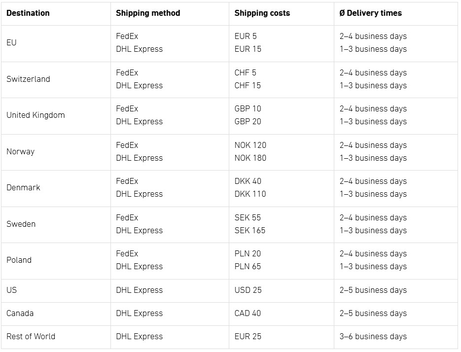 Standard shipping within the EU is free for orders over EUR 980 (for Germany over EUR 495) and takes approximately 2-4 business days, depending on availability. For all orders below this value, a shipping fee of EUR 5 (for Austria EUR 8) will apply.